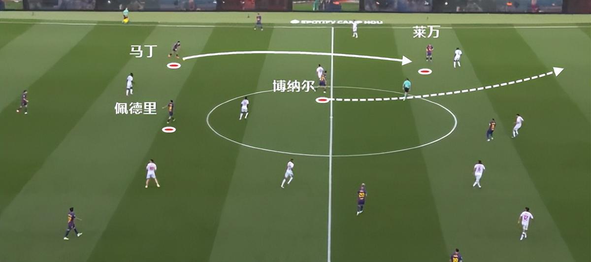 随后的这次进攻中也是一样的道理,莱万接应马丁直塞,这时候博纳尔就往前插了,佩德里再一次处于靠后的位置。